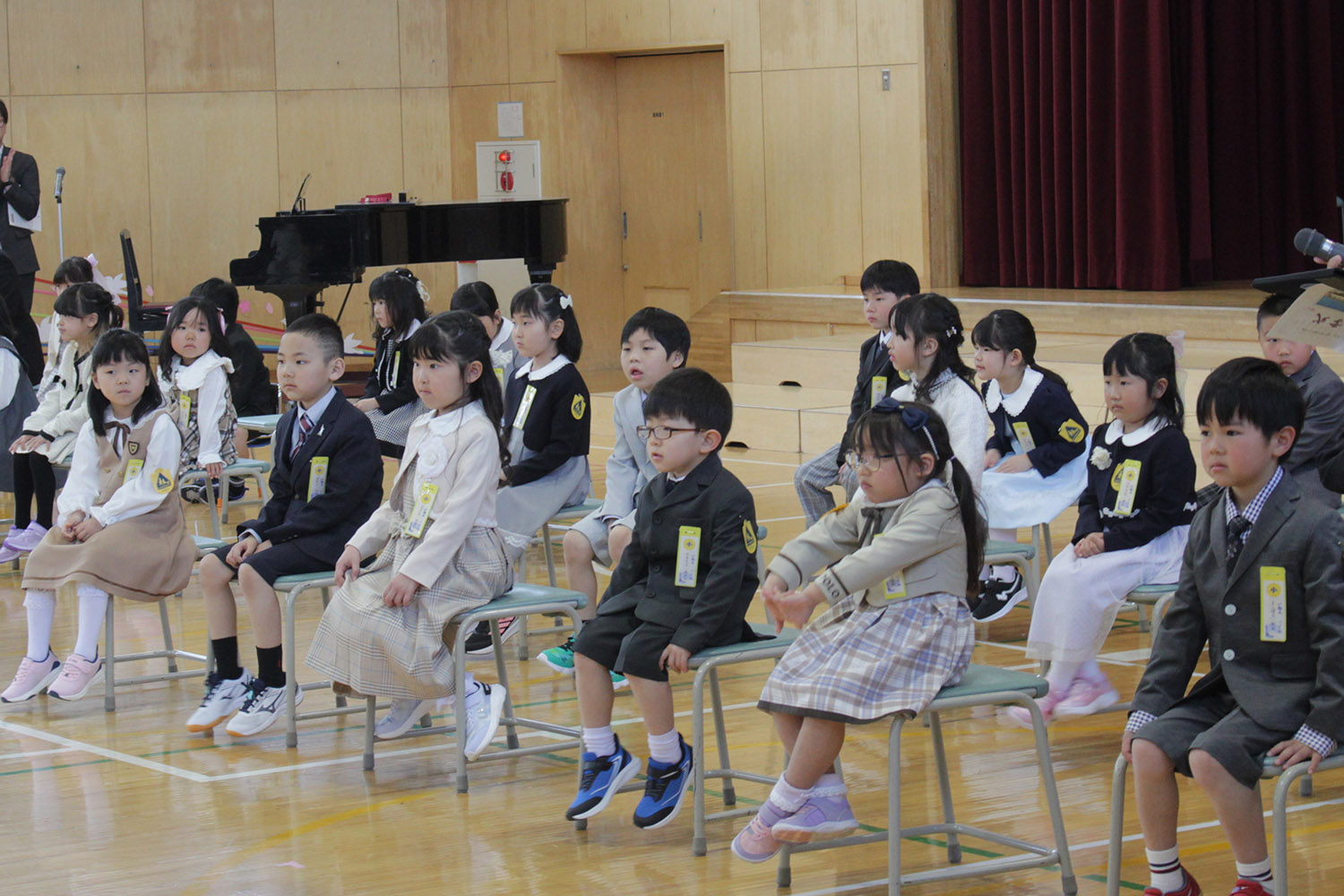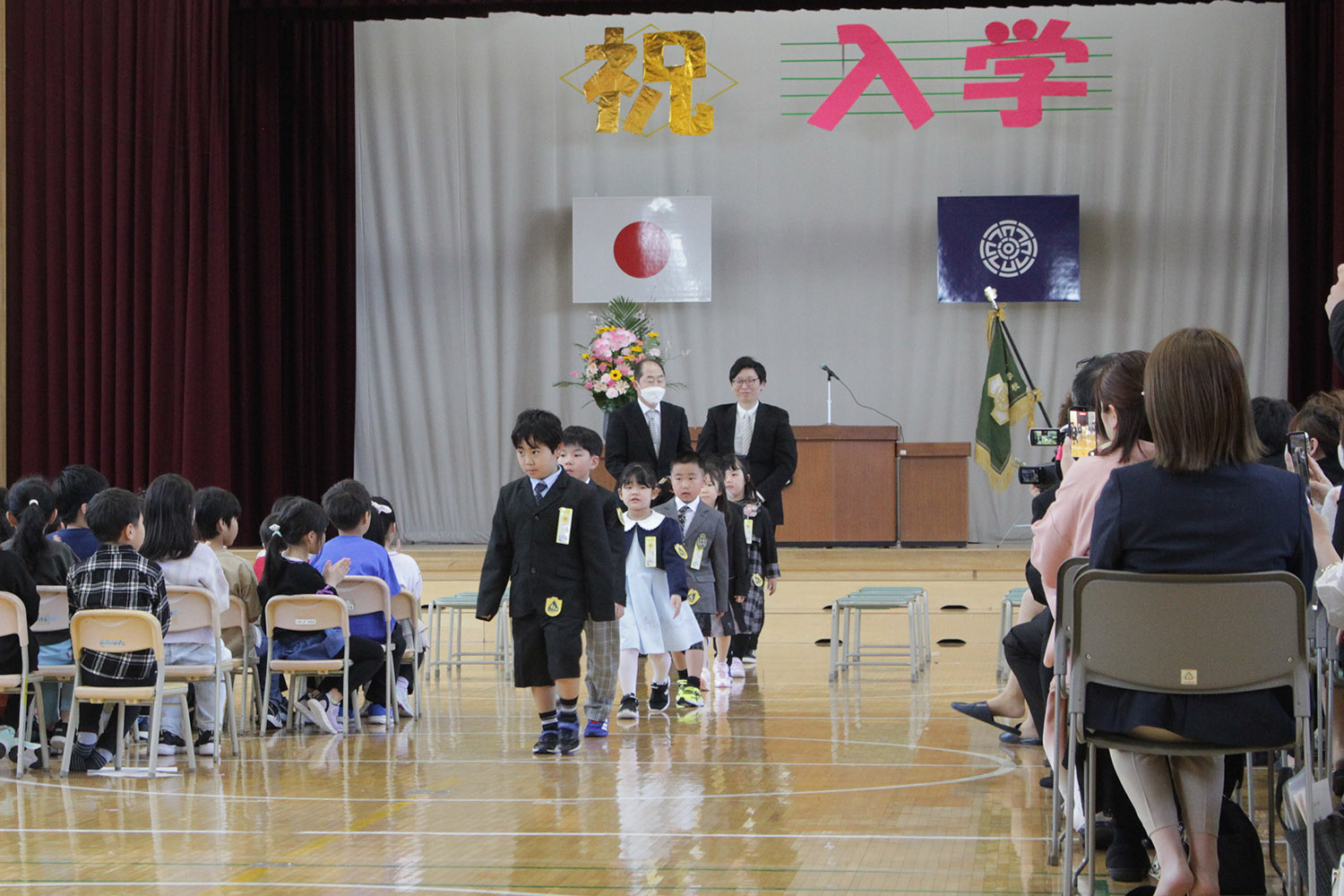 入学式では、先輩方に手を引かれて新一年生が入場。先生に一人ひとり名前を呼ばれると元気に返事をしていました。