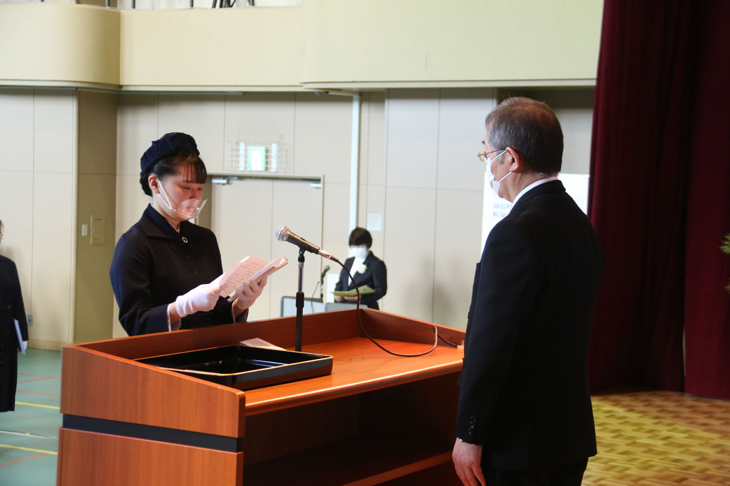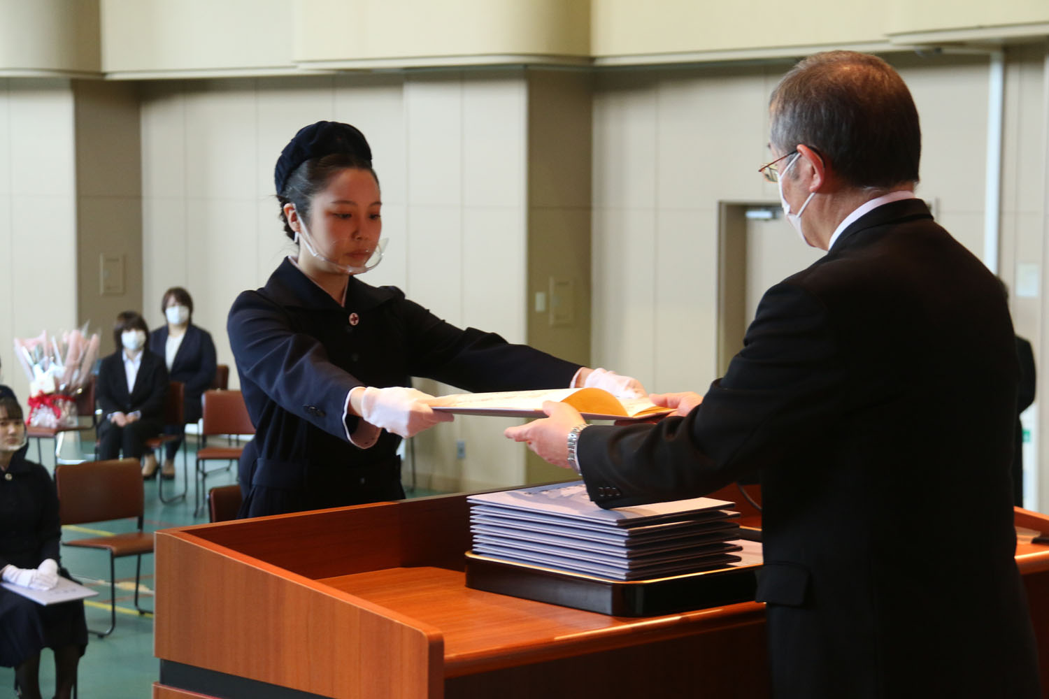 在校生代表の三浦朋佳さん(2年生)は送辞で、「先輩方は私たちが入学したころ、学校生活のことや寮生活のことだけではなく間違った事を叱ってくれたり、看護を目指す人としてのマナーや心構えを教えてくれた。私達も先輩方のように、患者さんにより良い看護をしていくために思いやりや主体性のある看護をしていきたい」と話し、卒業生代表の青木瑠衣さんは答辞で「3年間はあっという間で入学した当初は看護師になれるか不安だったが、学年が上がるごとに勉強や実習をえて赤十字看護としての自覚を実感しました。これからも患者さんにより良い看護を提供できるように努力していきたい」と看護師になる決意を述べました。