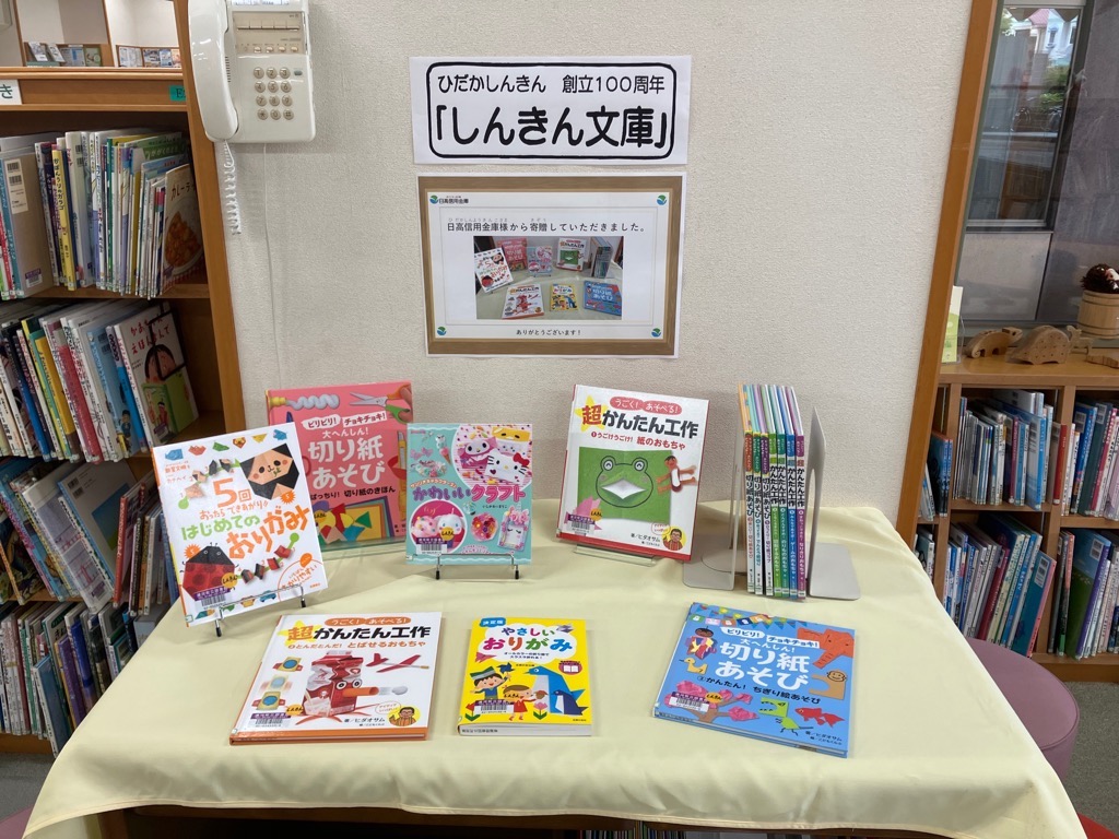 この寄贈は日高信用金庫の100周年記念事業の一環として行うもので、3年前より引き続き実施され、今年度は折り紙遊びや工作などの児童図書14冊が贈られました。