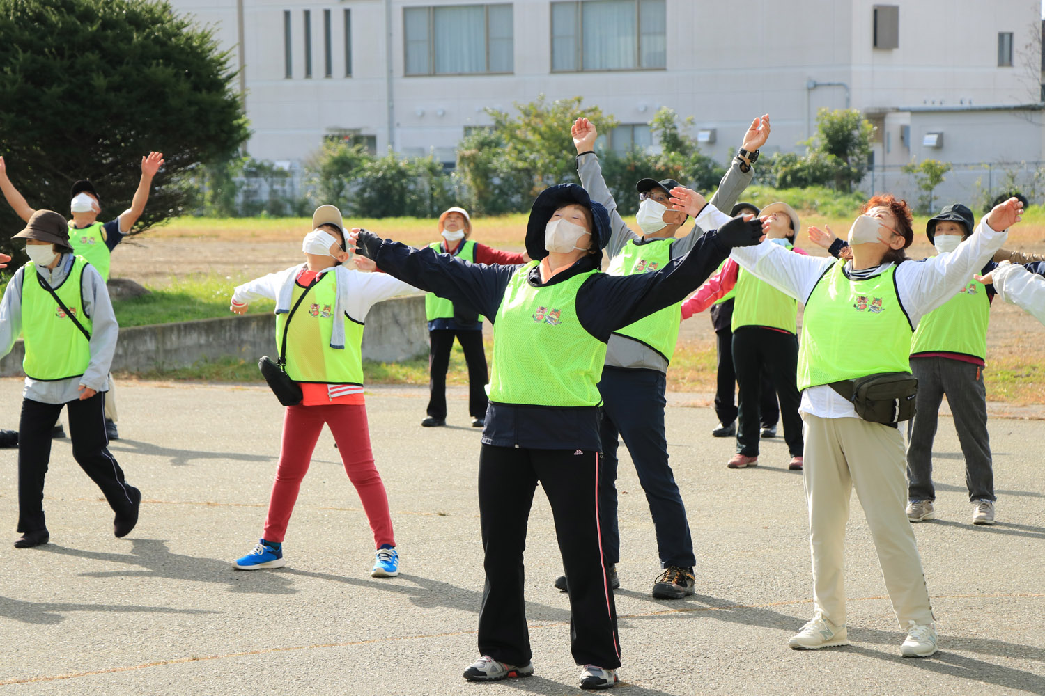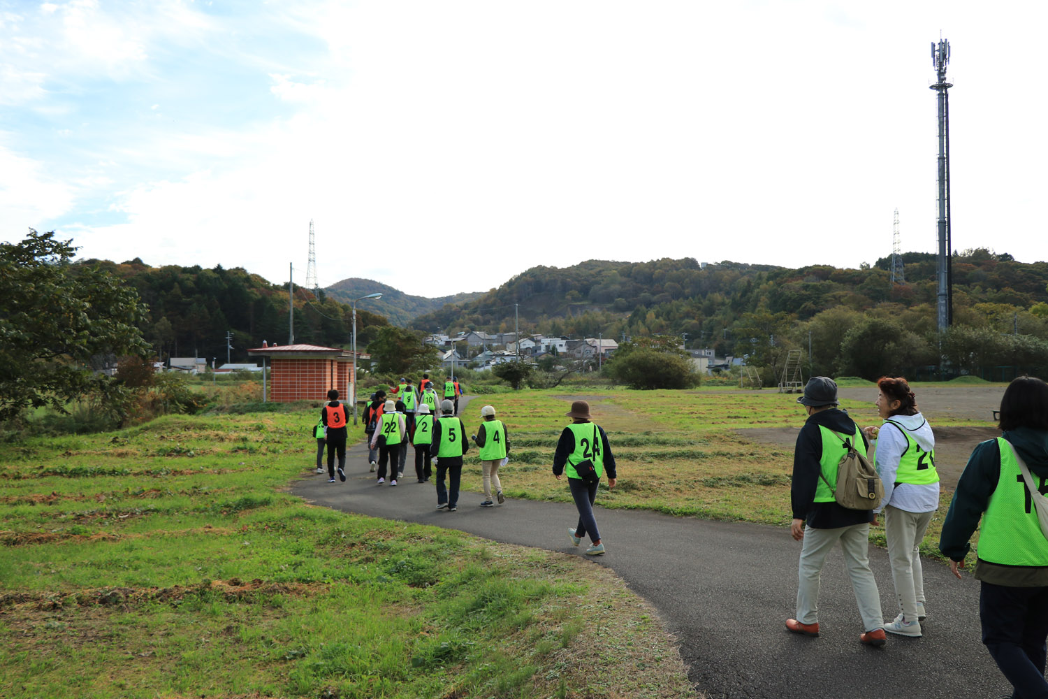 参加者らは前庭に集まり、ラジオ体操で準備運動をしたのち、普段は通らない向別川の堤防沿い(3.7km)を歩き、他の参加者と談笑しながらも秋の爽やかな風を感じ歩いていました。