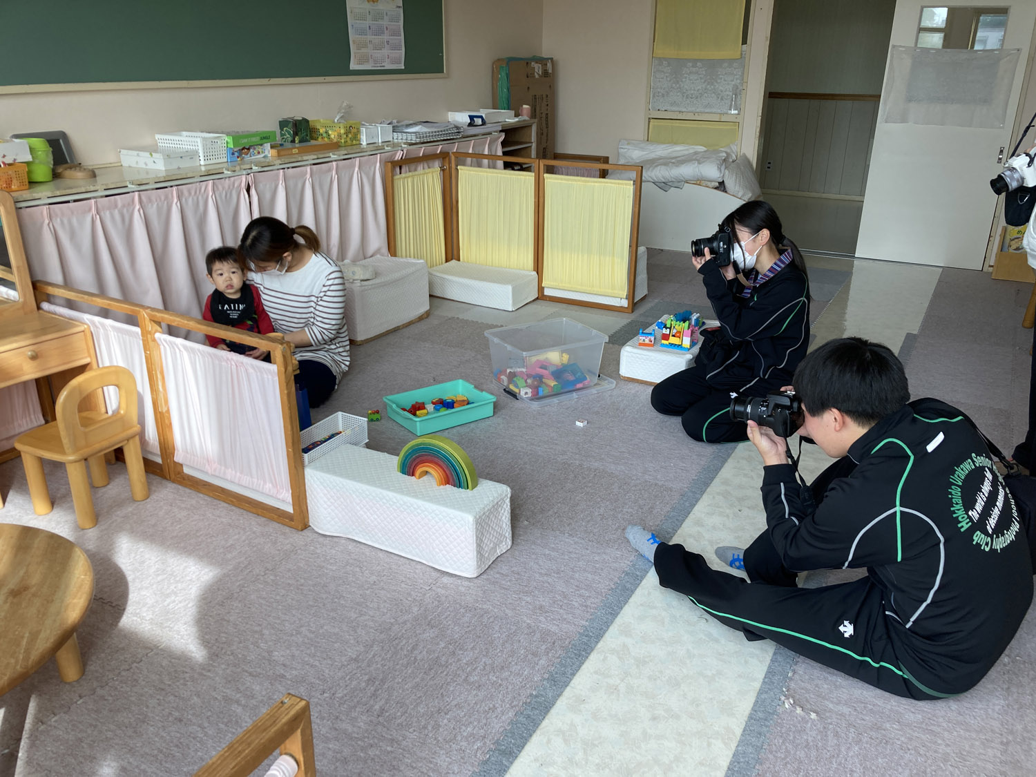 こんにちは、子育て医療課です。 浦河高校写真部の生徒が保育現場に触れ、その魅力を写真で発信する企画を進めています。10月14日は町立保育所を訪問、初めて会う高校生のお兄さん、お姉さんに緊張した幼児にも優しく接し、おもちゃで一緒に遊んだりして楽しみながら撮影しました。 来年の2月ころには写真展を開催する予定です。どうぞ楽しみにお待ちください。