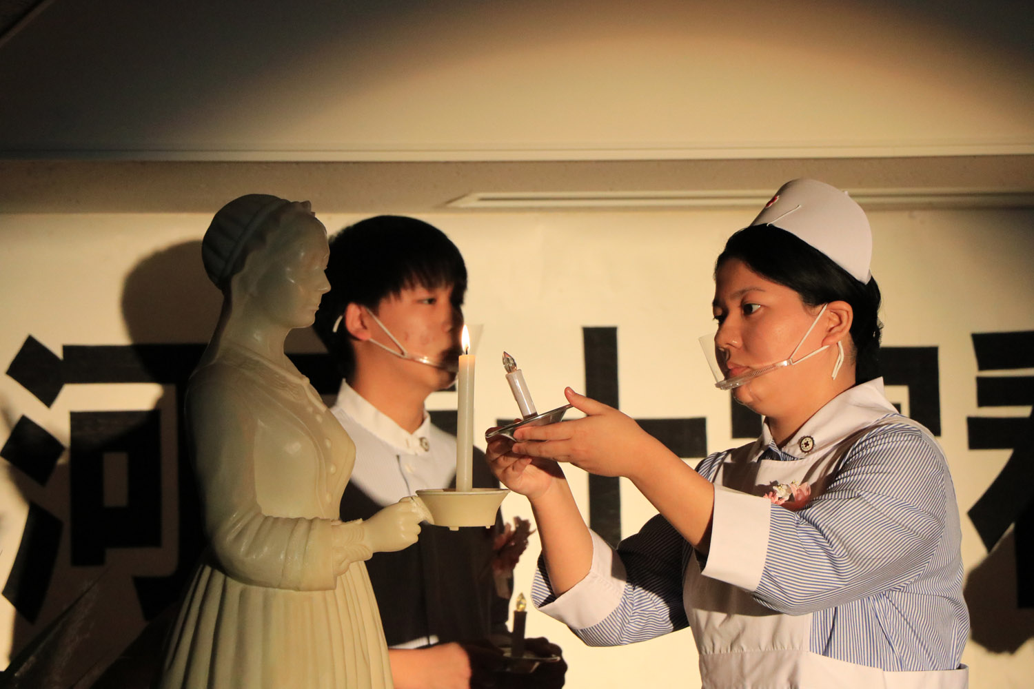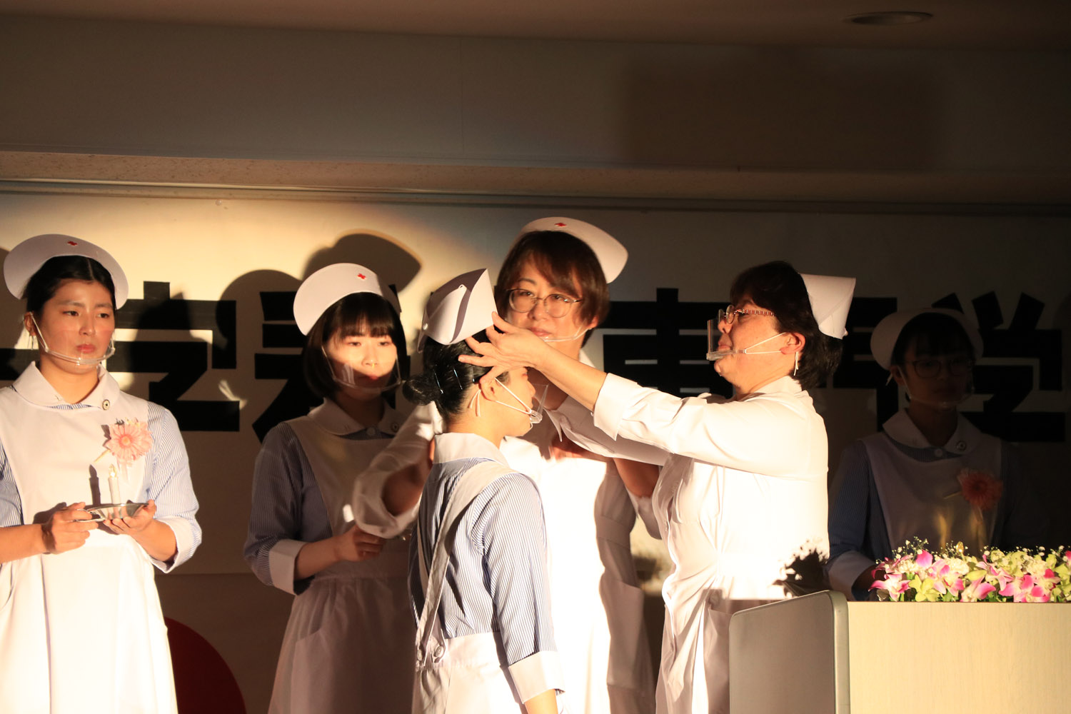 戴帽式は、看護師を目指すものとしての責任や認識、決意を新たにするもので、学生は一人ずつ登壇してナースキャップを被せてもらい、ナイチンゲール像のキャンドルから自分のキャンドルに明かりを灯し、誓いの言葉を唱和しました。