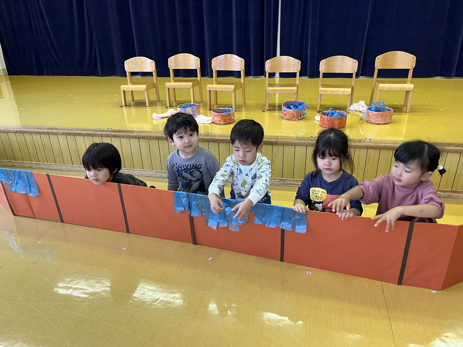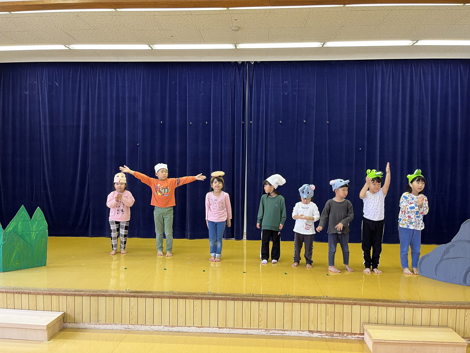 こんにちは、荻伏保育所です。 11月11日(土曜日)に行われる発表会に向けて、子ども達は「頑張るぞー!」と言いながら一生懸命練習をしていました。 最初はセリフや遊戯の振りが覚えられず、苦戦する姿も見られましたが、毎日の練習の中でできるようになっていき、自信を持って取り組むようになっていきました。 当日はたくさんのお客さんがいる中で、緊張しながらも練習の時のように頑張っている姿を見せる事ができるでしょうか?