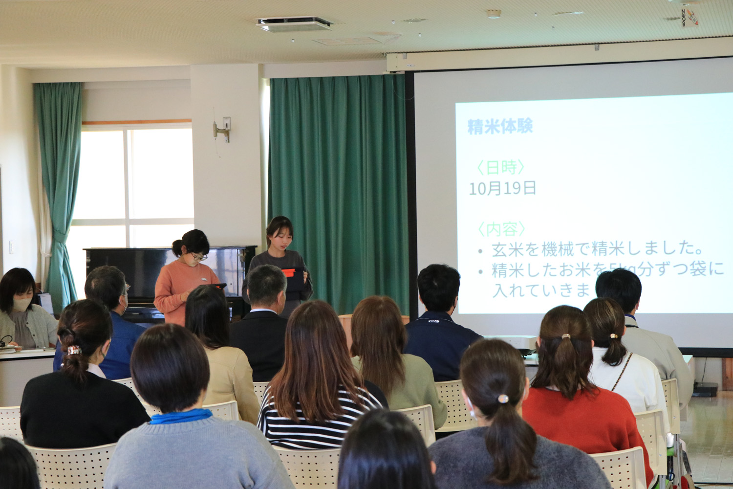 発表では米作りの歴史や品種改良の方法、47都道府県で作られているお米の種類などのテーマで発表。最後にクラスの代表の深澤玲菜さんが「体験を通して米作りの大変さや食の有難さを学ぶことができました。今年1年間ありがとうございました」と関係者へお礼の言葉を述べました。