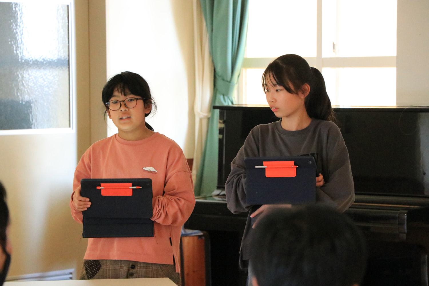 同小学校の5年生は、春から秋にかけて実際に米作りの田植えから精米までを体験し、その後自らが興味を持ったテーマについて調べ、お米作り体験の関係者へお礼の意味を込め発表を行いました。
