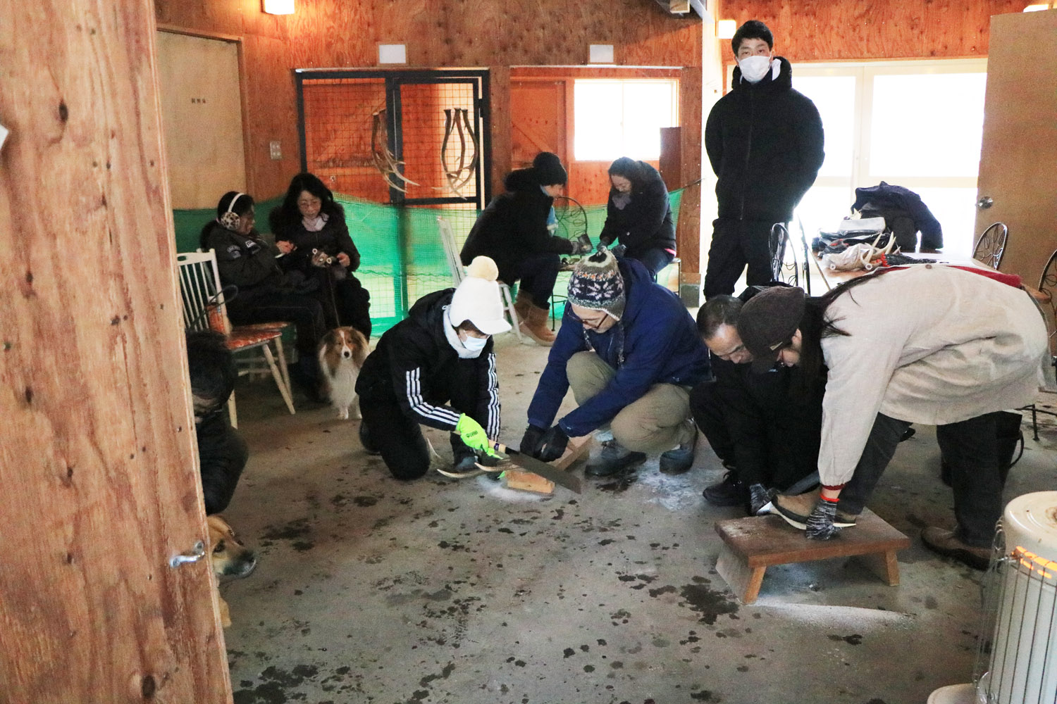 このワークショップは、鹿の角をのこぎりややすりなどで加工し、犬がくわえて遊ぶためのおもちゃを作るもので、参加者らは鹿の角を切るのに苦戦しながらも、愛犬のためにと奮闘していました。