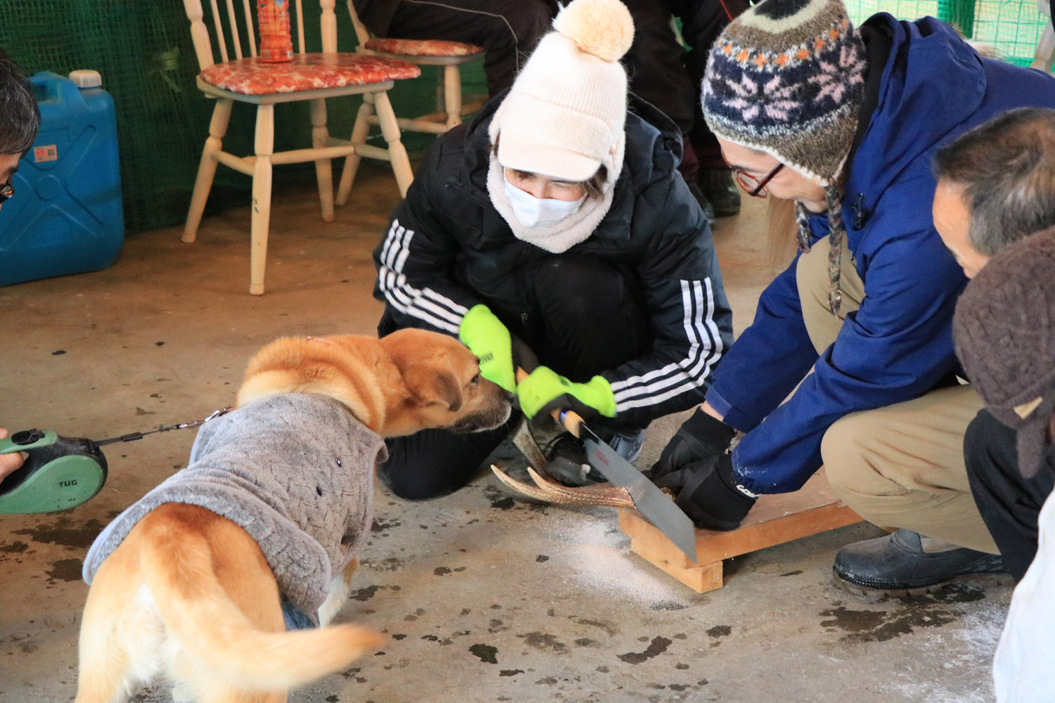 愛犬と参加した「鹿の角は固く切るのは疲れたが、楽しかった。普段家に居て散歩できない時間に暇つぶしにあげたいです」と話していました。