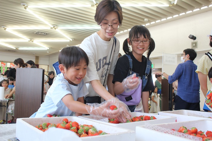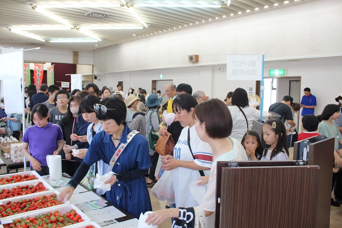 この日は1パック200円でいちごが売られたほか、詰め放題も行われました。また、いちごを使ったスイーツの販売や夏いちご「すずあかね」の後継品種である「すずりっか」との食べ比べなども行われ、大勢の来場者が夏いちごを楽しみました。